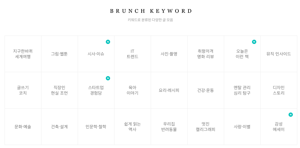 브런치보다는 분류가 다양하지는 않지만 6가지 범주로 묶고 있다는 생각이 듭니다.